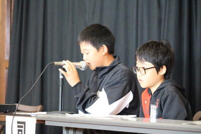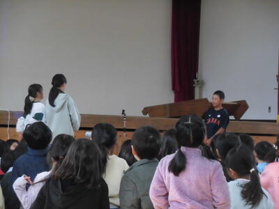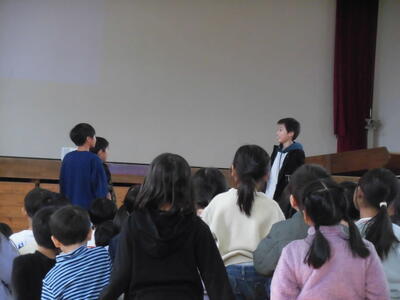 中・高学年は、校外学習などで学習したことから考えた自分たちの意見を、しっかりした口調で全校に伝えました。