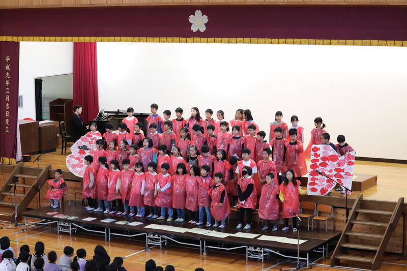 トップバッターは4年生。総合的な学習の時間で学んだ「水のめぐみと米作り」と合唱「手をつなごう」を発表しました。