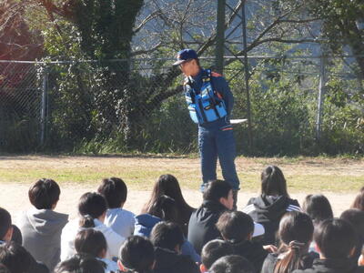 今日の二時間目は、消防署の方をお呼びして、地震が発生し火災が発生したとの設定で避難訓練を行いました。