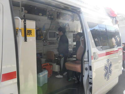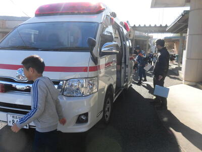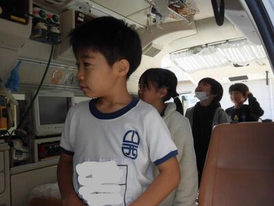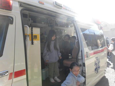 そのあと低学年は、救急車の中を見学することができました。車内には上から下までたくさんの機械や道具があり、珍しそうに見ていました。中には「ぼく乗ったことあるよ」と言っている子どももいました。