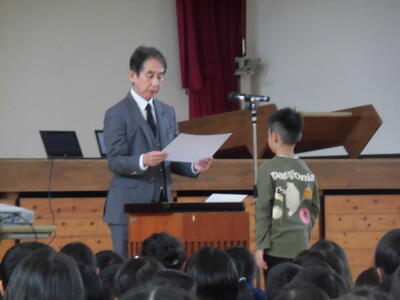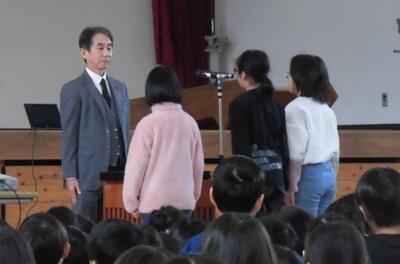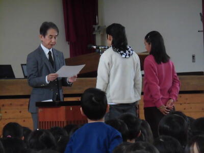 次はくまもと・子ども美術展の表彰です。阿蘇郡の各学校から出品された中から8人選ばれた特選に、2年生の3人が選ばれ表彰されました。来年には、展示もあるそうです。