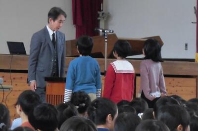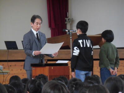 5時間目の児童集会では、たくさんの表彰と委員会からの発表がありました。司会は企画運営委員会です。