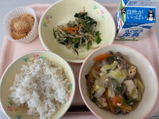 麦ご飯、牛乳、すき焼き風煮、ほうれんそうのおひたし、きなこだんご