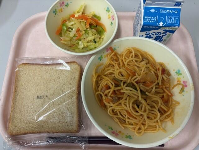 黒糖パン、牛乳、ナポリタン、チップスサラダ