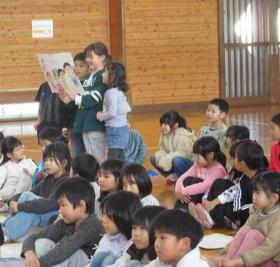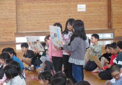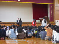 まず現1年生が、小学校生活を紹介してくれました。見学旅行のこと、運動会のこと、英語の時間のこと、給食当番のこと、掃除の時間のこと、幼稚園や保育園とはちょっと違う生活を紹介してくれました。