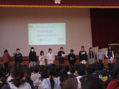 ボランティア委員会の発表は、今年度の活動のぎく荘への訪問、赤い羽根共同募金、書き損じはがきの寄付等の成果でした。