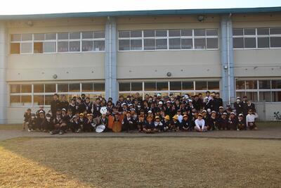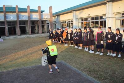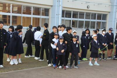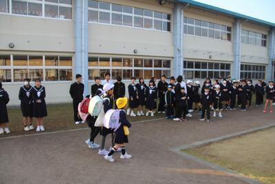 本校の「うたごえ広場」にて、小中合同のあいさつ運動を行いました。 八代第一中学校の生徒約50人が参加し、卒業生が児童に声をかける場面もありました。久しぶりの再会に笑顔が広がり、温かなふれあいの時間となりました。冷え込んだ朝でしたが、元気なあいさつが響き渡り、広場は明るい雰囲気に包まれました。 児童も中学生も互いに励まし合い、学校全体が一層温かい空気に満ちたひとときとなりました。中学生の皆さん、ありがとうございました。