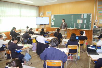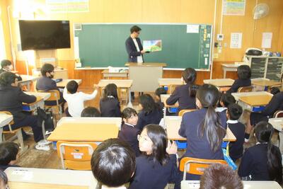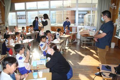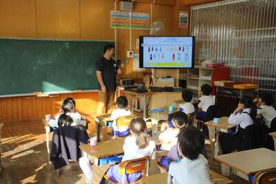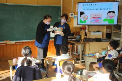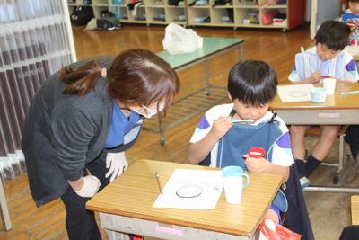 歯科校医のH先生と4人の歯科衛生士の方をお迎えし、2年生・4年生・6年生を対象に歯科指導を行いました。 画像は2年生での様子です。児童は歯の仕組みや健康の大切さについての説明をしっかり聞き、真剣な表情で学んでいました。その後、染め出しを行い、自分の歯の磨き残しを確認しました。鏡を見ながら「ここが赤くなっている!」と気づき、正しい磨き方の必要性を実感していました。最後にブラッシング指導を受け、歯ブラシの持ち方や動かし方を丁寧に練習しました。児童は「これからはもっとていねいに磨こう」と意欲を高めていました。今回の指導を通して、歯の健康を守るために毎日の習慣が大切であることを学びました。これからも「自分の歯は自分で守る」意識を育てていきます。H先生・歯科衛生士の皆様、ありがとうございました。