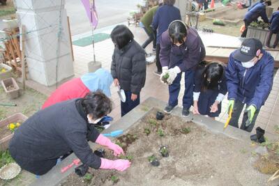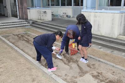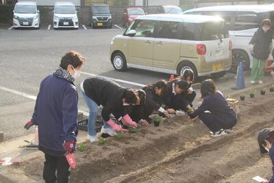 主任児童委員と民生児童委員の皆様とともに環境委員会の児童が「花いっぱい運動」を行いました。 この運動は県の事業に主任児童員の方が申請し、実現した取組です。学校園にパンジーなどの花苗やチューリップの球根を植え、ポンポンデージーなどの種まきも行いました。児童は地域の方々から植え方を教わりながら、丁寧に土をならし、心を込めて花を植えました。活動の中で、協力する楽しさや自然を大切にする気持ちを育むことができました。学校園は、これから色とりどりの花でいっぱいになります。児童は「みんなで育てた花が咲くのが楽しみ!」と笑顔を見せていました。地域と学校が力を合わせて取り組むことで、環境を美しくするとともに、子供たちの心も豊かに育まれています。主任児童委員と民生児童委員の皆様、ありがとうございました。
