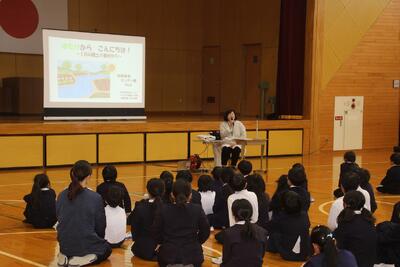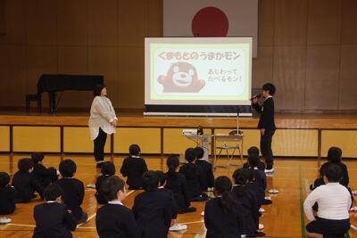 白鳥っ子集会(児童集会)では、給食記念週間の取組の一つとして、西部給食センター栄養教諭のM先生をお招きし、給食についてのお話をしていただきました。 八代産のトマトを使った献立の工夫や、地元の食材を味わうことの大切さなどについて、動画の視聴やクイズへの解答などを活用して児童に分かりやすく教えてくださいました。お話の最後には、給食委員会の児童が代表して、日頃の給食づくりへの感謝の気持ちを込めてお礼の言葉を伝えました。 子どもたちは、毎日の給食が多くの人の支えによって作られていることを改めて感じる時間となりました。M先生、ありがとうございました。