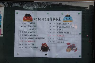 2月が始まり、今年度も残すところあと2ヶ月となりました。 本校では、新しい月のスタートに合わせて、担当職員が正門近くの掲示板の月予定表を張り替える作業を行いました。登校してくる子どもたちや保護者の皆さまが、ひと目で今月の行事を確認できるよう、丁寧に掲示を整えています。 これからも、学校生活がより分かりやすく、安心して過ごせる環境づくりに努めてまいります。