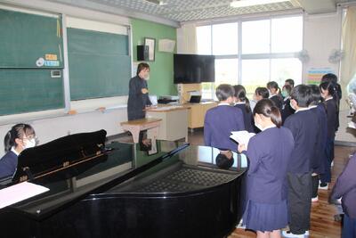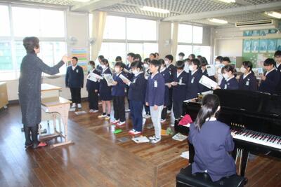 卒業式でより心のこもった歌声を届けられるよう、地域で活躍されている元音楽科教員であり、合唱団の指揮者の方を講師としてお招きし、6年生が発声指導を受けました。指導では、体の使い方や言葉の響かせ方など、歌うための基礎を丁寧に教えていただきました。子どもたちは、普段とは違う専門的なアドバイスに真剣に耳を傾け、回を重ねるごとに歌声がどんどん美しく変化していきました。卒業式当日、6年生が自信をもって歌声を届けられるよう、これからも練習を重ねていきます。