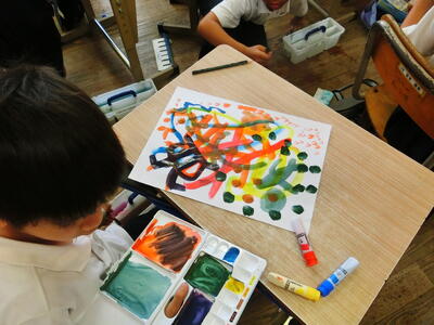 図工で「絵のぐ+水+ふで=いいかんじ!」という学習をしています!まず、ふでの使い方を知るために、グラデーションやドライブラシ、点、まぜるなどの6種類のふでの使い方を練習しました。練習の段階から、子どもたちは「すごい!」と声を上げながら楽しそうにふでを使っていました。そして、次の時間は、実際に自分で様々な色やふでの使い方を考えて、作品作りをしました。グラデーションを使っている人や、ドライブラシを使っている人、線を重ねている人、色々なふでの使い方を組み合わせている人など、自分たちで考えて自由に作品を作っていました。今週で、作品が完成する予定です!