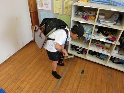 最後は、片付けです。まず、ペットボトルで筆を洗い、水気を切って筆を整えきれいにしました。そして、半紙を使ってすずりをきれいにしたり、ゴミをまとめたり、道具をバックに片付けたりなど、話を聞きながら頑張って片付けをしました。少しずつ、準備や片付けがスムーズにできるようになってほしいと思います。