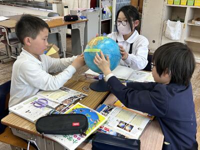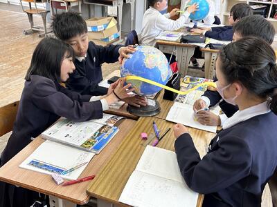 4月17日(木)の社会の授業で、「日本から南アフリカ共和国までの距離はどれくらい?」という疑問をもち、みんなで解決するために学習を行いました。 紙テープを使って地球儀専用のものさしを作り、距離を測りました。ひとつの目盛りが2500kmだから…と計算をしながら結果を出すことができました。自分たちが計画したワールドツアーの距離も測ることができたようです。今後も地球儀や世界地図を使って学習を進めていきます。これからの学習も楽しみです! |
