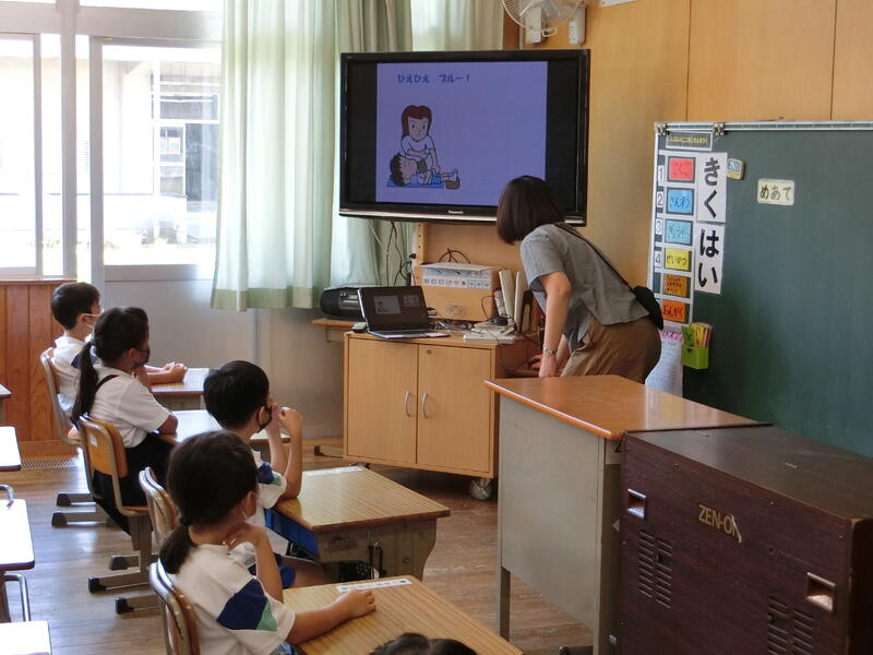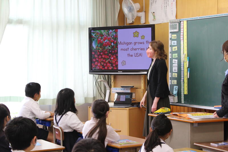 後半は、ALTのサマンサ先生の自己紹介を兼ねたプレゼンテーションを見ました。クイズあり、写真ありで子供たちも大盛り上がりでした。これからの外国語活動の授業もとても楽しみです。