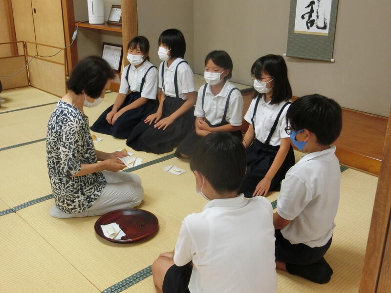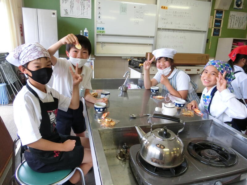 5年生の家庭科で「お茶の入れ方」を学習し実践しました。人数分のお茶の葉、水を準備し、コンロでお湯を沸かしました。初めてガスコンロを使う子供もいて、「火がつきません!」の声が上がる班、沸騰した状態がよく分からず「いつ止めたらいいですか?」の声が上がる班などありました。しかし、無事にお湯を沸かし、湯飲みにつぎ分けることができました。週末の宿題で「お茶の入れ方の実践」を出しています。ぜひ子供たちにおいしいお茶を入れてもらってください。