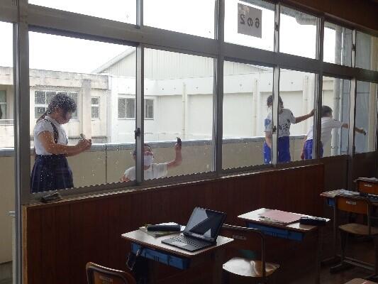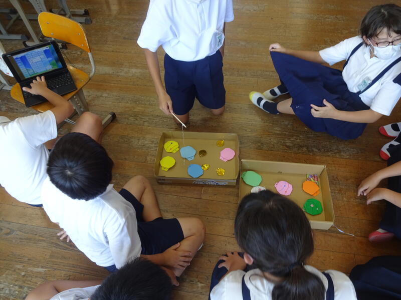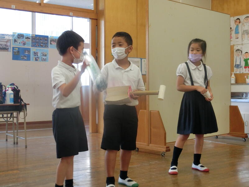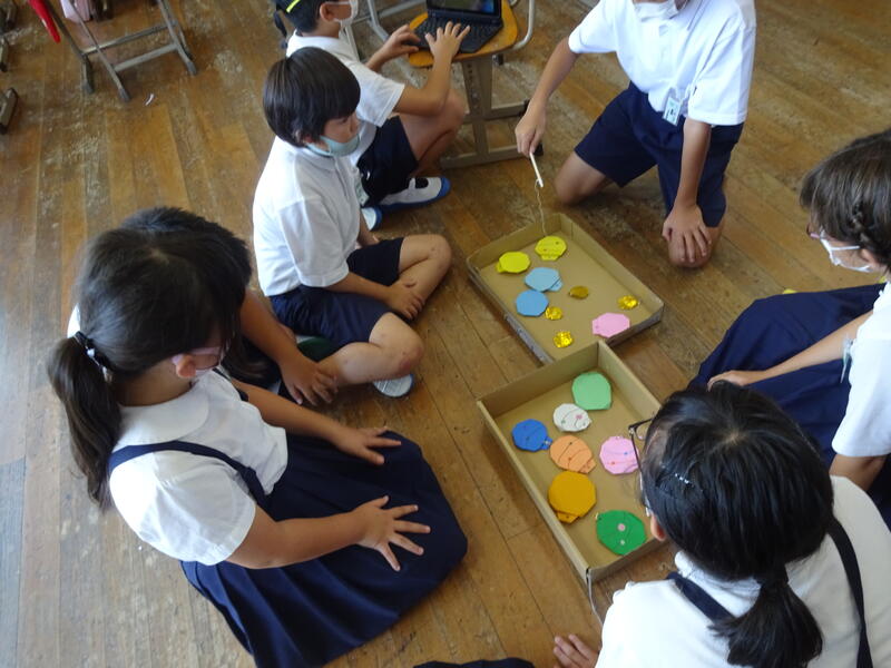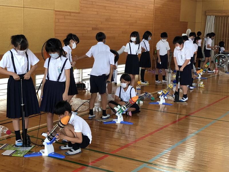 ペットボトル飛ばしでは、空気の入れる量や羽の向きを調整しながら飛ばしました。空気がなかなか入らないので、3人で一緒に空気を入れたり、よく飛んだ班にコツを聞きに行ったり、試行錯誤して飛ばしていました。遠くの飛んだときは、歓声が上がっていました。