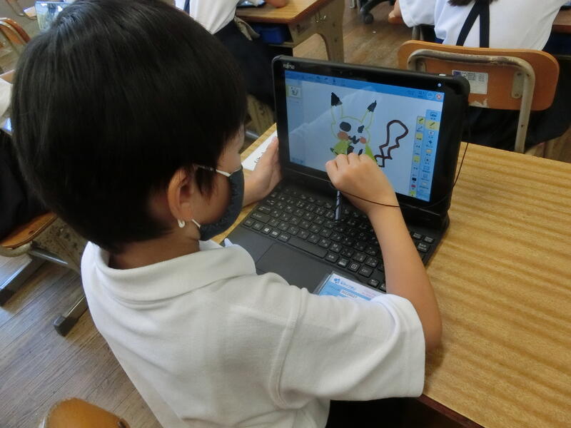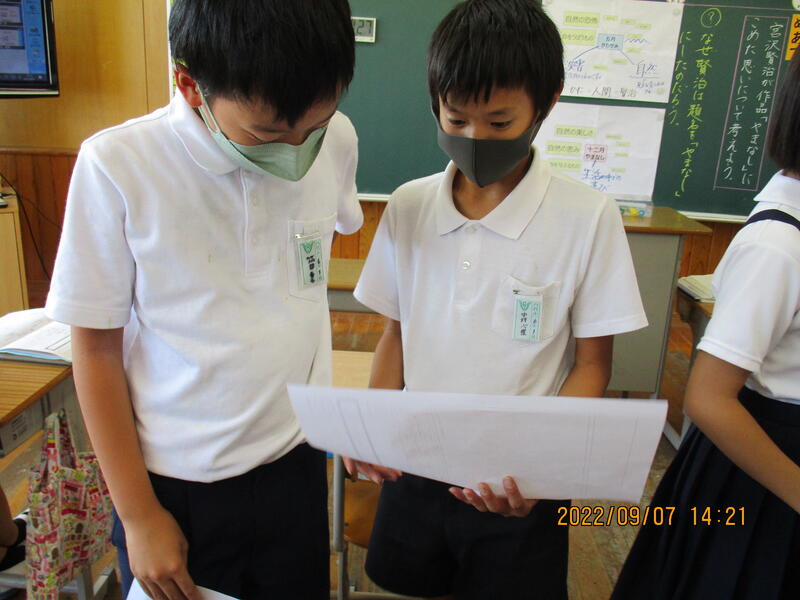 宮沢賢治の作品の中でも、この「やまなし」は特に独特の世界観に引き込まれる作品です。「クラムボンって何?」「宮沢賢治は何を伝えたいの?」など、たくさんの「?」から始まった学習ですが、「やまなし」の世界や作者の思いなど自分なりに捉えたことをタブレット端末を使って解説書プレゼン)を作っています。出来上がりましたら保護者の方や兄弟にも紹介する予定ですので楽しみにお待ちください。