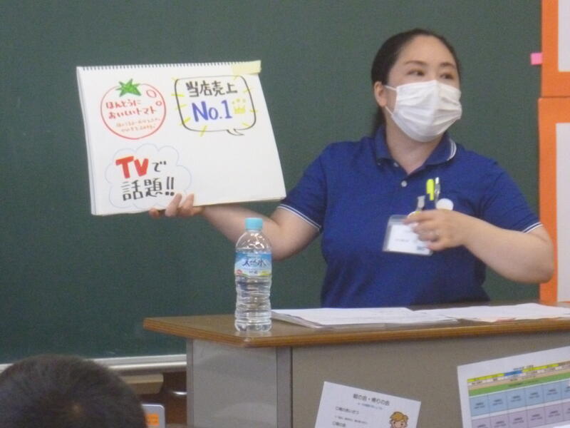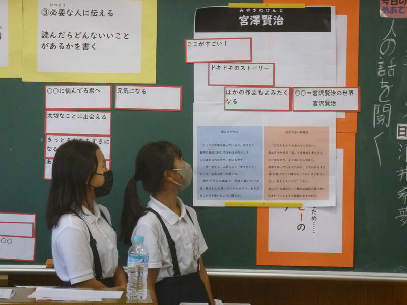 国語の学習で「作家の魅力を伝える紹介カード作り」を行いました。 そこで、キャッチコピーの作り方のコツを八代市立図書館の田口さんと上村さんに教えていただきました。