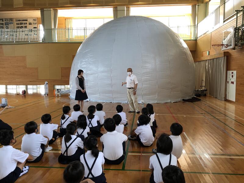 わくわくしながら体育館に行くと、中に大きなドーム状でプラネタリウムがありました。プラネタリウムの中では、理科で学習している夏の大三角や天の川、夏の星座などを見せていただきました。ドームの中でみんなで寝転がって楽しく学習ができました。