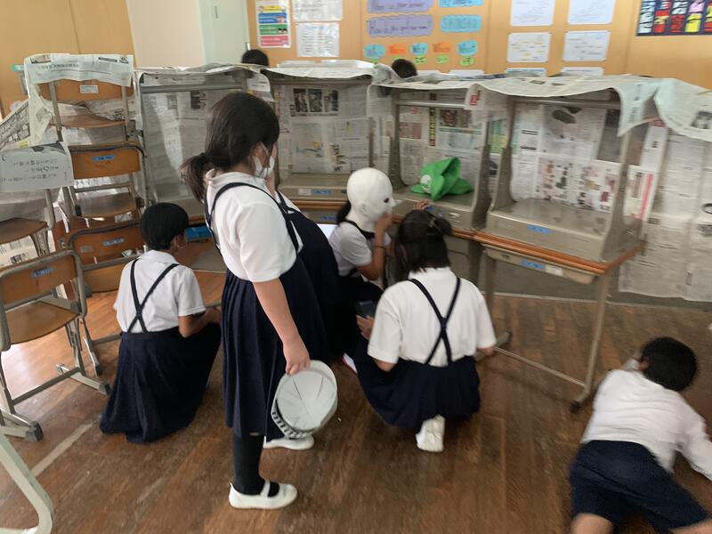 自分たちで案を出し合い、2つのグループに分かれてお互いを驚かすお化け屋敷ゲームをしました。本番までに、みんなそれぞれで試行錯誤しながら一生懸命に道具を作っていました。本番は子供たちにも緊張感がありました。1学期最後のとてもいい思い出になりました。