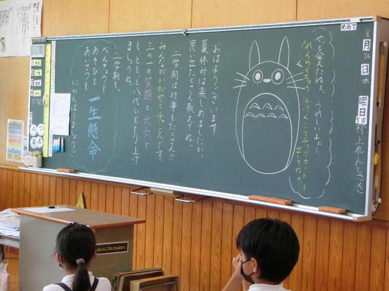 夏休み明けの教室の黒板には、どの学級も担任の先生からの温かいメッセージが書かれていました。