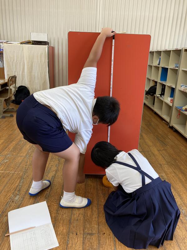 教室の横の長さ、黒板の横の長さ、机の回りなど2人で協力して測ることができました。予想とは大きく外れるペアもあれば、数センチのずれのペアもありました。