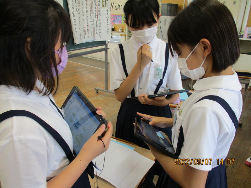 紹介する国でどんなことができるかをタブレットを使って調べ、その国の特徴的な食べ物や観光地、お土産などを英語で書いたり、友達とやり取りをする練習をしたりしています。