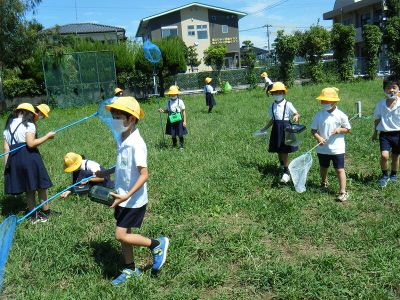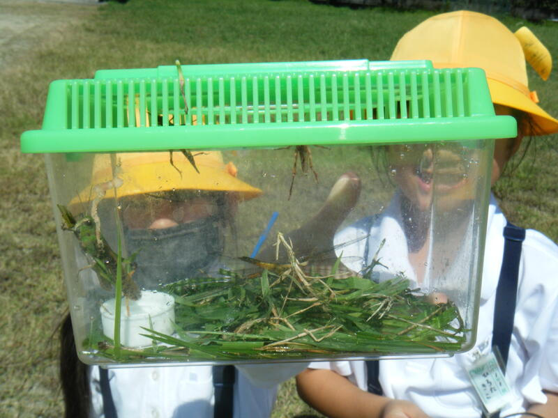 捕まえた後は観察です。「バッタの顔ってよく見ると、赤いところがあるんだよ」「バッタが今水を飲んでいるよ」「前は虫を触れなかったけど、もう平気だよ」「このトンボはなんという名前か調べてみよう」など、たくさんの発見や経験ができています。