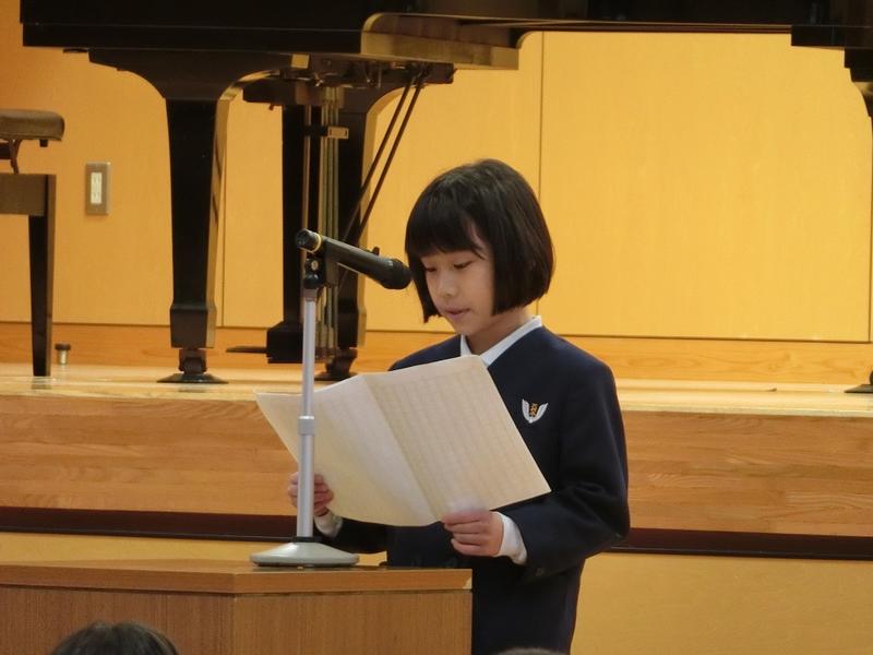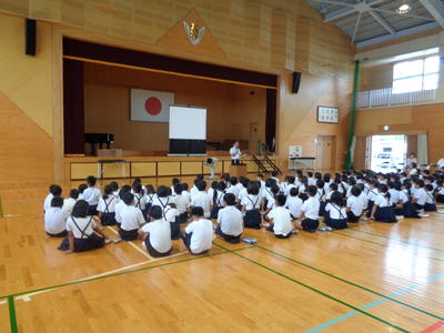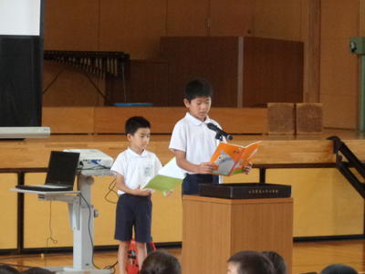 まず、1学期の振り返りを2年生と6年生の代表の子が発表し、その後、校長先生のお話がありました。