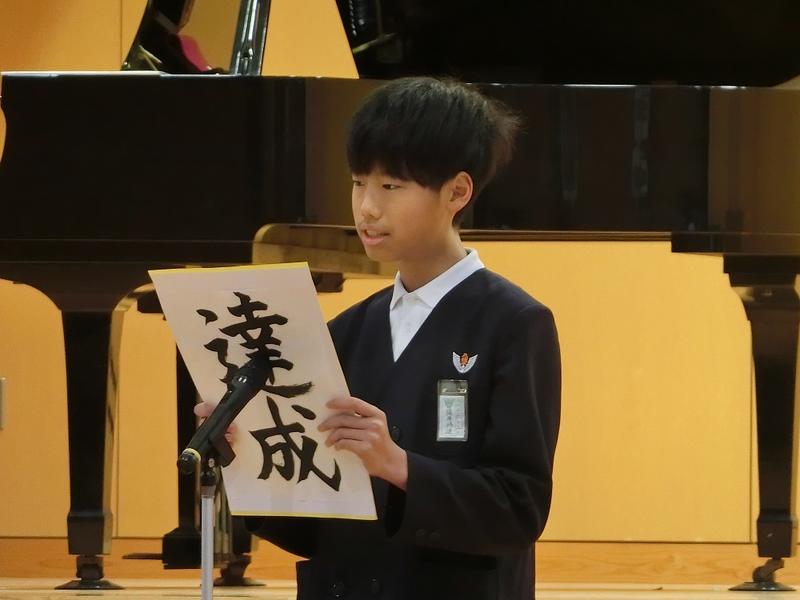 代表児童の決意表明では、6年生の児童が「達成」の二文字を掲げ、力強く目標を述べました。