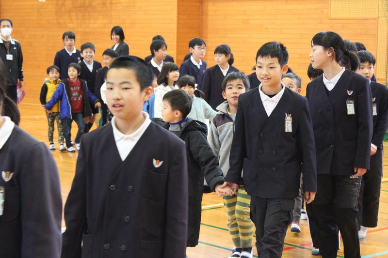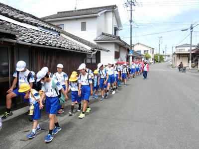 出発前に体育館で1年生を迎える会を行い、その後、校区の蛇籠公園に向けて出発しました。