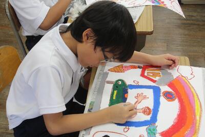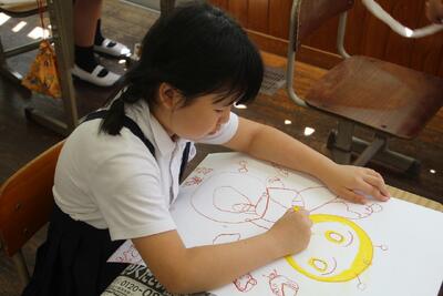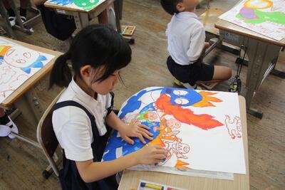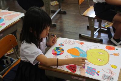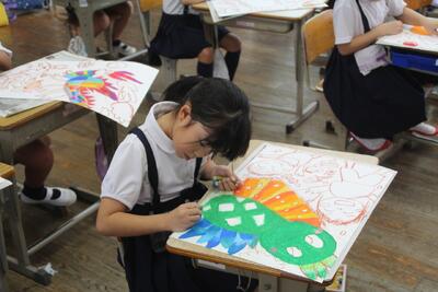 めあて: 色を混ぜながら、楽しみながら描こう 丁寧に色塗りを進めています。 |