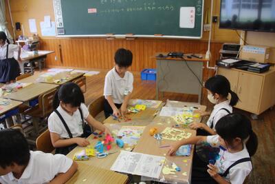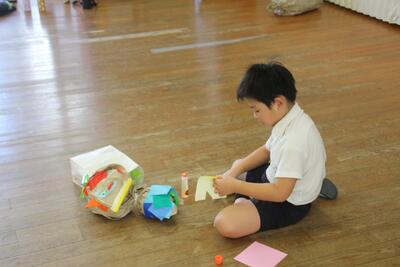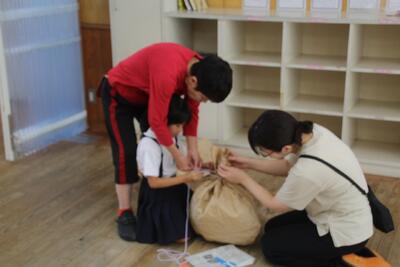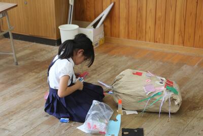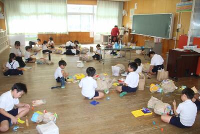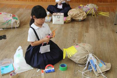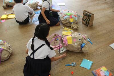 | 「くしゃくしゃぎゅっ」は、体育館横の2年1組の教室で制作中。 |