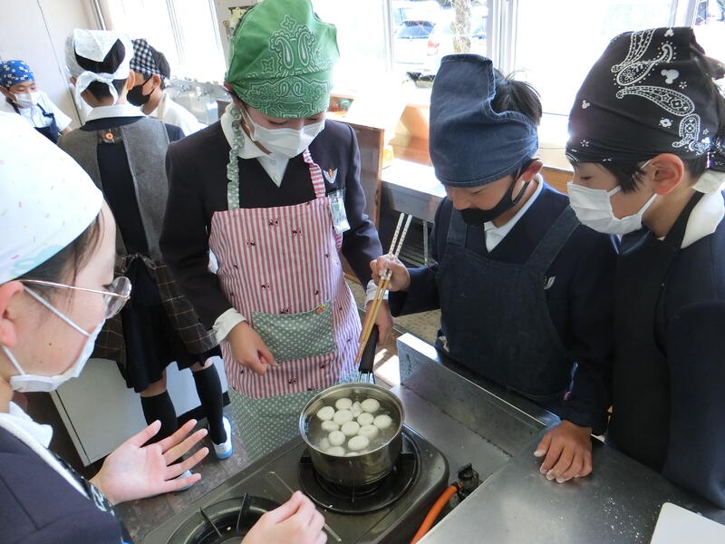今回は、地域の方々に「だご汁」の作り方を教えてもらいました。具材は、大根、人参、白菜、里芋、しいたけ、あげ、鶏肉、団子で、赤・黄・緑の栄養のバランスがしっかりとれています。