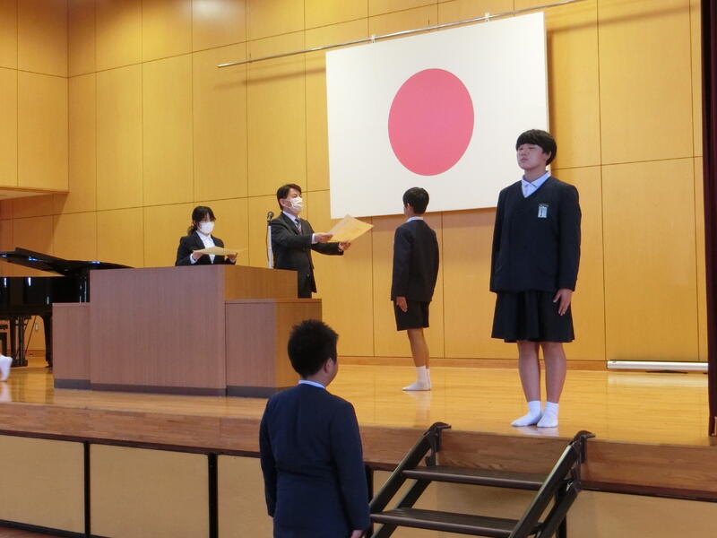 学校教育目標の「自ら学ぶ子供」や「やつしろスピリッツ(あいさつ・ききかた・そろえかた)」、「自分の心に線を引く」について、校長先生からお話がありました。