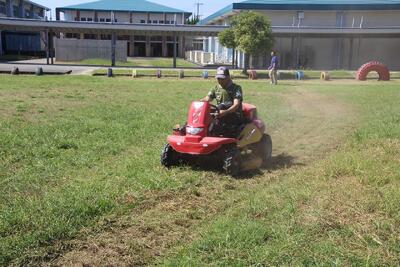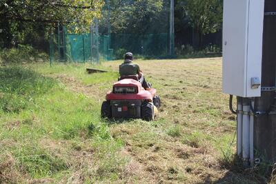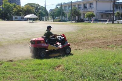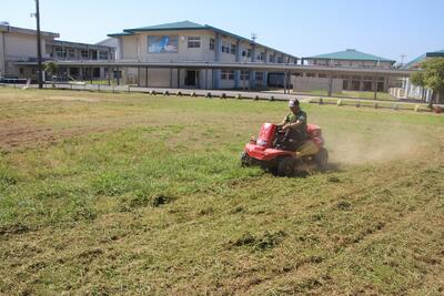 エコエイトやつしろ様よりお借りした乗用草刈り機を使って、運動場の外側の草刈り作業を行いました。教頭先生が運転を担当し、広い敷地も短時間で見違えるほどきれいになりました。乗用草刈り機の力強さと効率の良さに、児童や教職員からも驚きの声が上がりました。安全で快適な環境づくりのために、こうした整備は欠かせません。ご協力いただいたエコエイトやつしろ様に、心より感謝申し上げます。これからも、地域と連携しながら、児童が安心して過ごせる学校づくりを進めてまいります。