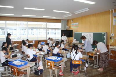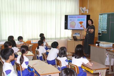 2学期がスタートして全学級で身長と体重の測定を行っています。この日は4年生が測定を行い、その後養護教諭から「早ね・早おき・朝ごはん」の話がありました。「早ねをするよさは何ですか」「早おきをするとなぜ体にいいのですか」「朝ごはんのメニューにはどんなものがいいのですか」など具体的な問いかけをし、児童がそのことについて深く考えました。話の最後に「夢をかなえるために健康が大切」という言葉がありました。「早ね・早おき・朝ごはん」を行い、自分の成長につなげてほしいと思います。ご家庭での声かけ、よろしくお願いします。