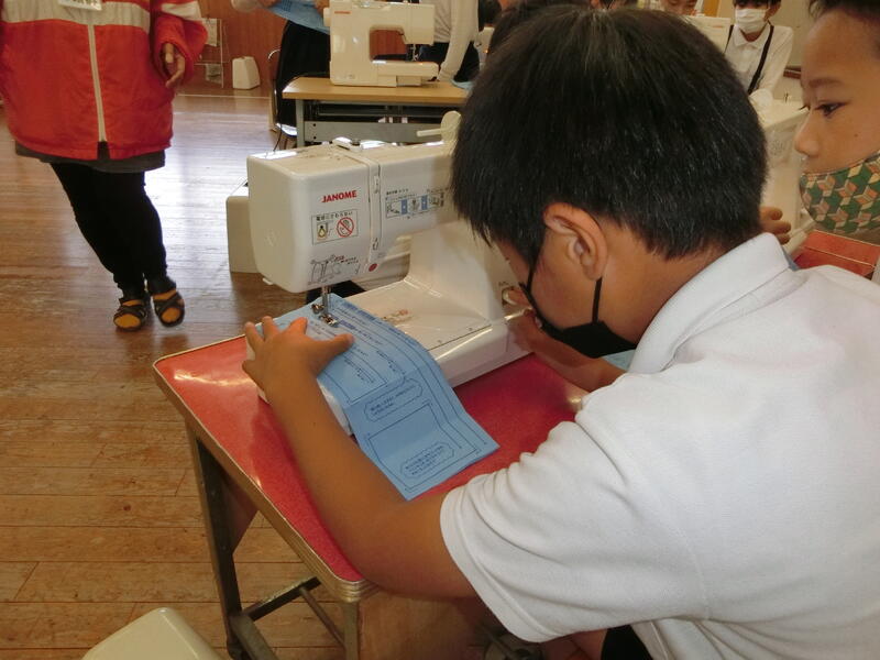 ミシンの授業をとても楽しみにしていた5年生の子どもたちでしたが…、「先生、ミシンが動きません!」「あー、まっすぐ縫えない」「先生、いつナップザックを作れるようになるんですか?」と大苦戦の子どもたちです。上糸のかけ方や下糸の出し方をやっと覚え、練習布で直線縫いや方向転換、返し縫いができるようになりました。5時間目でようやく自分たちで操作しながら縫えるようになったので、いよいよナップザック作りに入ります。完成が楽しみです!