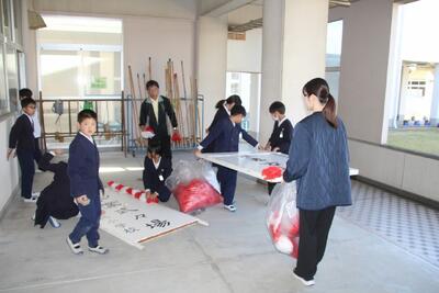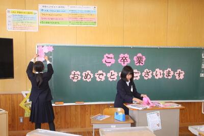 午後から5年生が卒業式準備を行いました。式場となる体育館では、椅子並べや長机の設置などを協力して行い、細かなところまで丁寧に整えてくれました。また、校舎内外の清掃活動にも積極的に取り組み、気持ちよく式を迎えられる環境づくりに大きく貢献しました。さらに、6年生の教室の飾り付けでは、感謝の気持ちを込めて掲示物やメッセージを準備し、卒業を迎える6年生への温かい思いがあふれる空間を作り上げました。