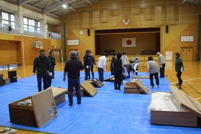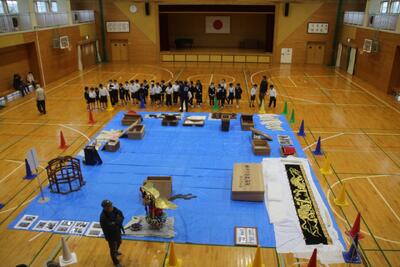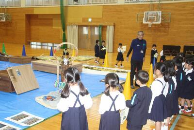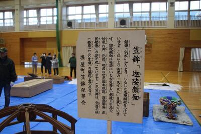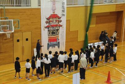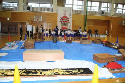 妙見祭で練り歩く傘鉾「迦陵頻伽(かりょうびんが)」の虫干しが、本校体育館で行われました。 当日は、塩屋地区を中心とした保存会の皆さま約20名が来校され、貴重な傘鉾を披露してくださいました。児童は、間近で見る迫力ある傘鉾に目を輝かせながら、保存会の方々の説明に熱心に耳を傾けていました。 地域の伝統を守り続ける思いや工夫を知ることで、児童にとって地域の文化を誇りに感じる貴重な学びの時間となりました。