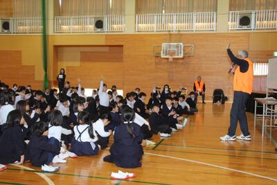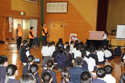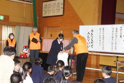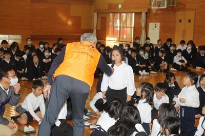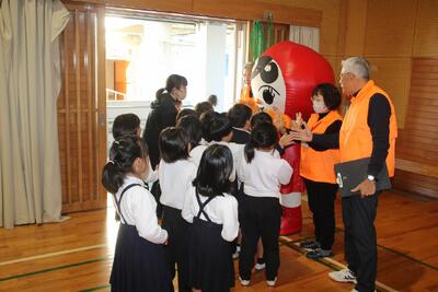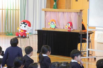 法務局から5名の人権擁護委員の皆様を講師にお迎えし、人権教室を実施しました。 はじめに、DVD「みーつけた」を視聴し、命の尊さ、必要な自己表現、自分や友達のよさ、協力や協調などについて学びました。続いて、人権まもるくんとあゆみちゃんの人形が登場し、「必要なことは伝えること」「よさを認め合うこと」「みんなちがって、みんないい」というメッセージを、分かりやすく楽しく教えていただきました。終盤には、バルーンで作られた大きな“あゆみちゃん”が登場し、会場は大きな歓声に包まれました。児童は目を輝かせながら、楽しみつつ大切な学びを深めることができました。今回の人権教室を通して、児童は日々の生活の中で、相手を思いやり、互いのよさを認め合う心を育むことの大切さを実感しました。講師の皆様に心より感謝申し上げます。
