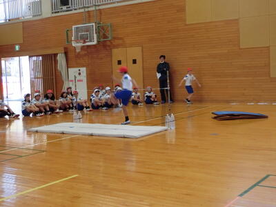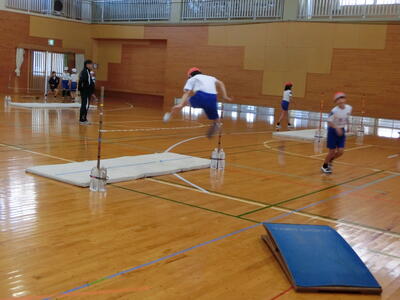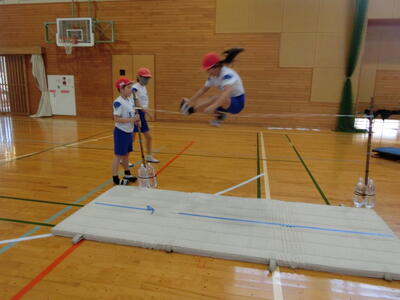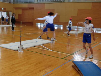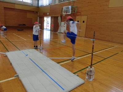 体育では、校長先生にご指導いただいて、走り高跳びに挑戦しています。一人一人が目標を設定し、どうやったらクリアできるのかを考え、コツを探りながら記録を測定しています。助走のリズムや踏切のタイミング、着地の足など、コツをつかむにつれて記録が伸びてきました。最後の記録測定が楽しみです。