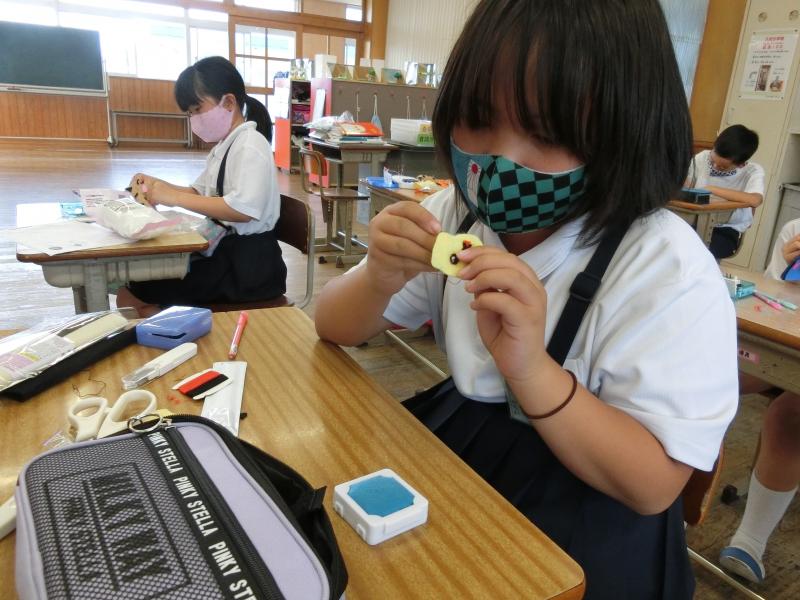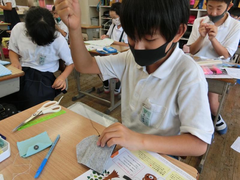 5年生では裁縫道具を使って小物づくりをしました。小物入れ、巾着、はさみケース、マスコットなど、学習したことを生かしながら自分の好きなように作っていきました。最初は、玉結びだけでもあんなに苦戦していたのに、今では工夫してボタン付けもできます。初めて作った小物は、少々不格好かもしれませんが世界でたった一つの小物です。家族にプレゼントしようと思っている人もいるようです。ぜひ使っていただければと思います。