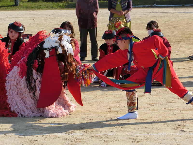八代小学校に獅子舞が来ました!間近で見る獅子舞の迫力に圧倒されました。今回は6年生の児童2人が舞い上がり、たたき納めでした。丁度、新しくALTになられたばかりのサマンサ先生も一緒で、「すごい!」と感動されていました。妙見祭は中止になりましたが、子供たちも祭りの雰囲気を味わうことができ、大変貴重な時間となりました。