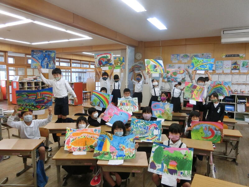 2年生の読書感想画「カメレオンのかきごおりや」の作品が出来上がりました。お話を聞き、想像を膨らませ、自分が描きたいものを時には画像、時には図鑑で調べながら一つ一つ丁寧に描きこんで仕上げていきました。どの子の作品も個性豊かで素晴らしいものになりました。教室に掲示していますので、授業参観の折にぜひご覧ください。
