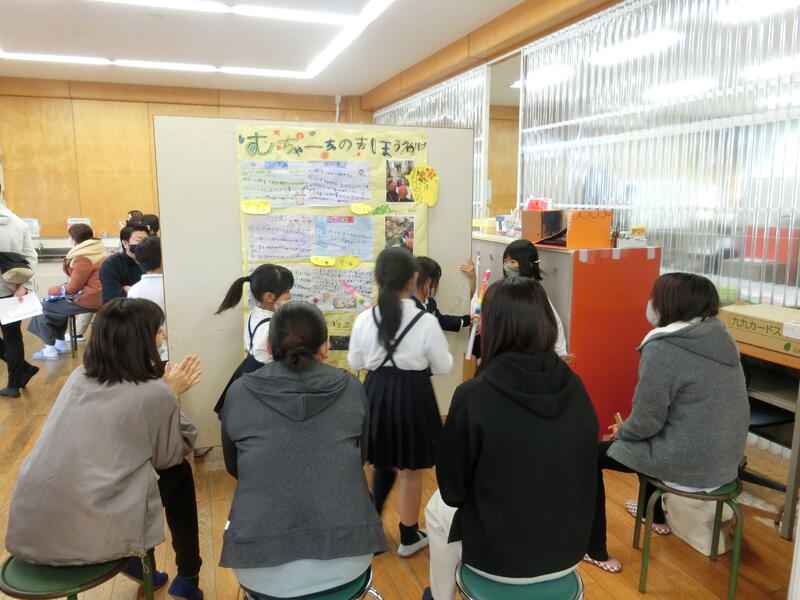 1年生の生活科では、自分たちで作った「ドングリ迷路」「マラカス」「松ぼっくりけん玉」で遊びました。校長先生も遊びに来てくださり、折り紙をプレゼントする子もいました。1組が教室に2組の友達を招待したり、2組が1組を招待したりと、学年全体での交流をしっかりと深めることができました。