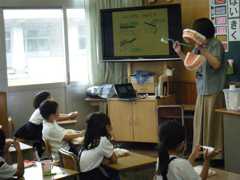 養護教諭の松野先生に「歯」についてのお話をしていただきました。1年生の子供たちには、「6歳臼歯」という大切な歯が生えています。この6歳臼歯を丁寧に磨くために、ブラッシング指導をしていただきました。
