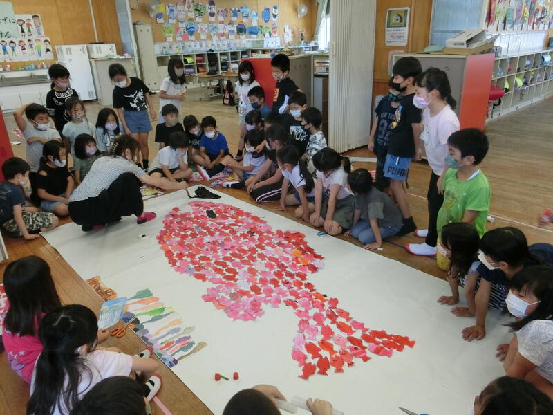 スイミーの赤い魚の兄弟たちをたくさんつくり、まぐろを追い出すところを再現しました。その周りには、スイミーに出てくる「いそぎんちゃく」や「くらげ」などを描き、「すばらしいもの」や「おもしろいもの」を表現しました。